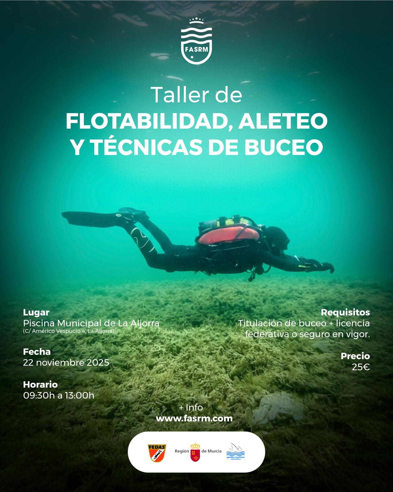 Desde la escuela de la FASRM ponemos en marcha la organización de un taller práctico de buceo el próximo sábado 22 de noviembre de 2025, en la Piscina Municipal de La Aljorra.